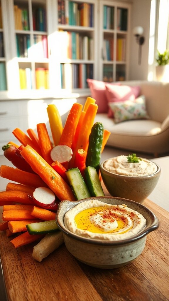- Arrange all the vegetable sticks on a plate and serve with a bowl of hummus for dipping. Enjoy your healthy and delicious snack!
