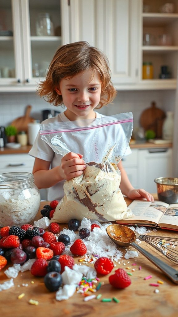 - In a small zip-top plastic bag, combine heavy cream, whole milk, sugar, and vanilla extract. Seal the bag tightly, ensuring there is no air inside.