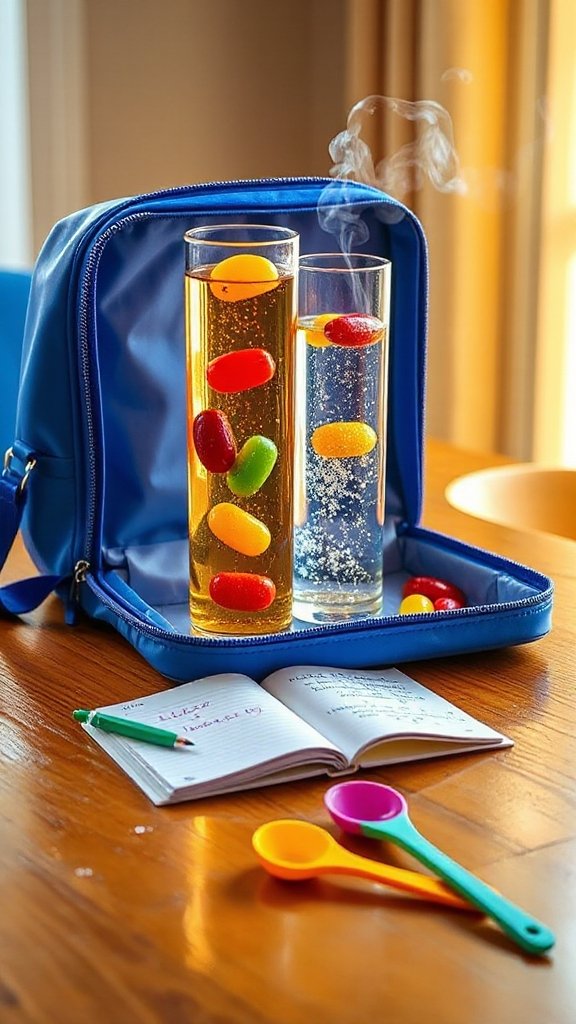 - Finally, carefully place the jelly beans on top of the oil layer, allowing them to float based on their density. Observe and record which jelly beans sink, float, or hover in the layers! Enjoy your tasty science experiment!